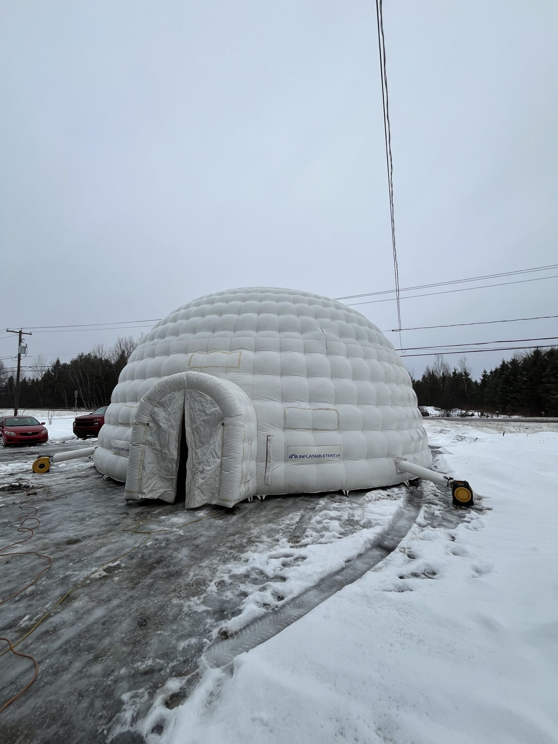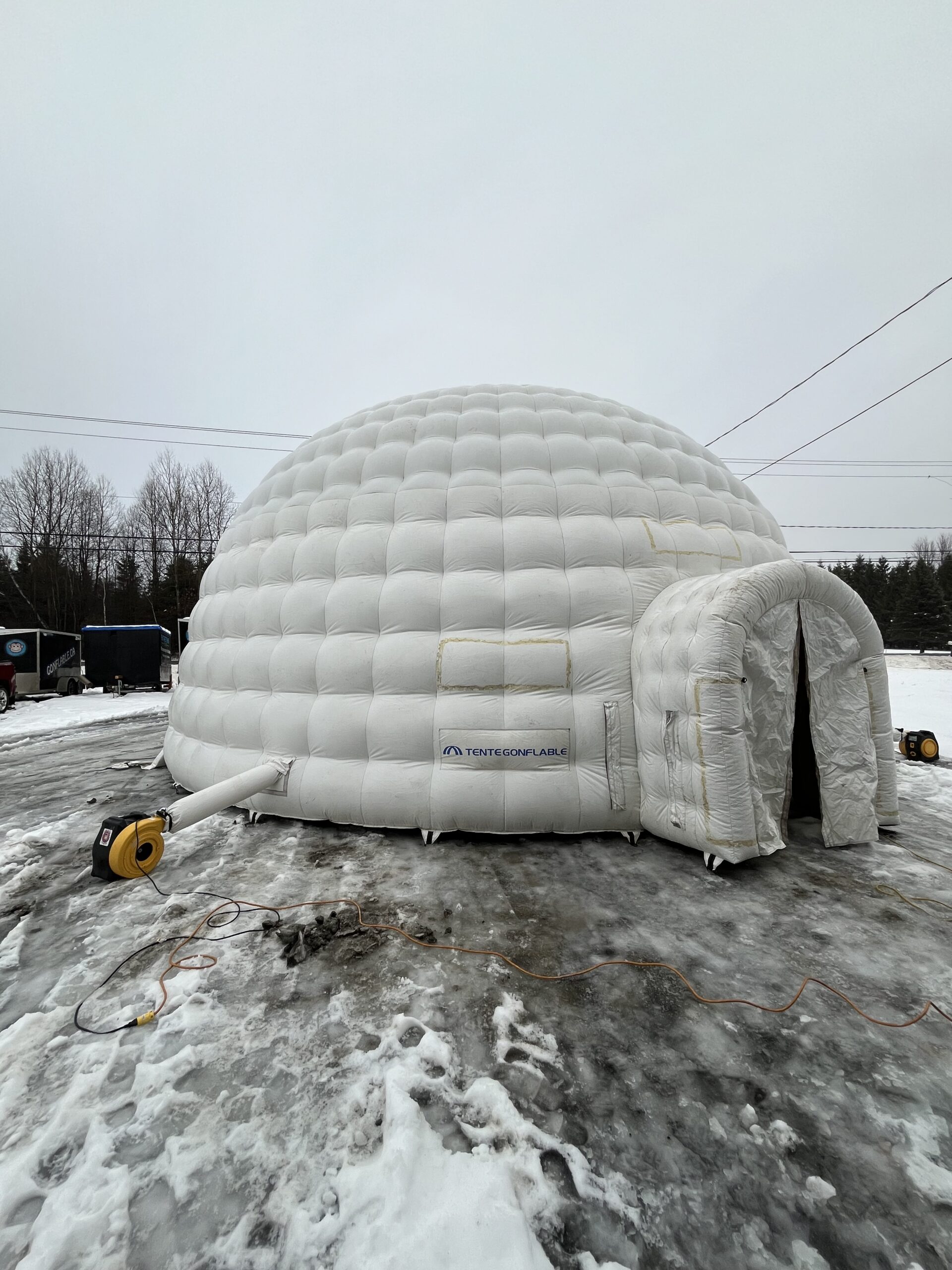 Grand Igloo gonflable avec intérieur gris. Cet abri saura protéger vos inviter des caprice de dame nature. Utilisable à l'année, il est idéale pour y installer des divertissements , jeux ou un air de repos à l'intérieur.
