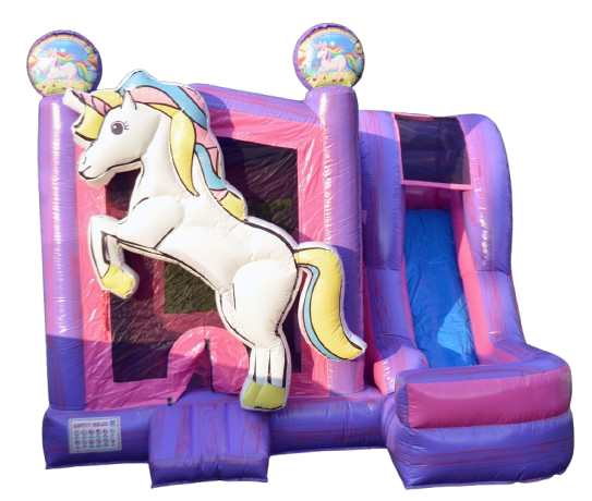 Jeux sous le thème des licornes avec un espace pour sauter et s'amuser. Terminer votre tour par glissade double. Excellent pour les enfants de 3 ans et plus