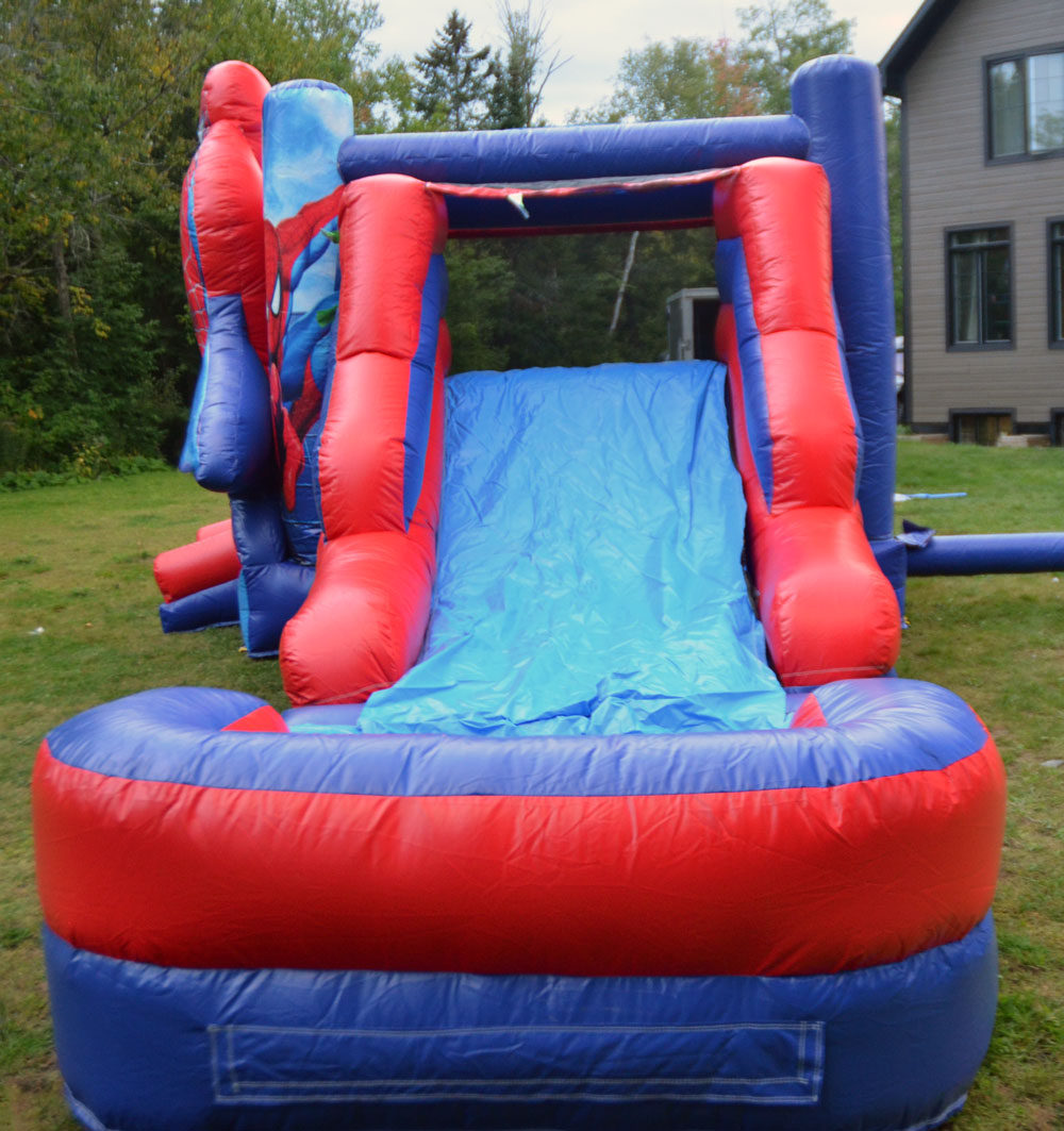 Jeux sous le thème de Spiderman avec un espace pour sauter et s'amuser en été il vient avec l'option piscine pour mettre de l'eau pour en faire un des meilleur jeu pour ce rafraichir. Terminer votre tour par glissade double. Excellent pour les enfants de 3 ans et plus