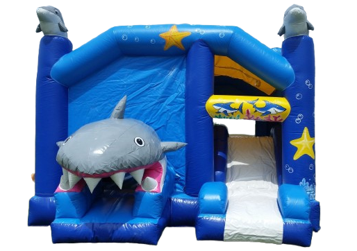 Un jeu gonflable avec un requin et des dauphins à l'intérieur, une glissade et un toit pour les journée trop ensoleillé.